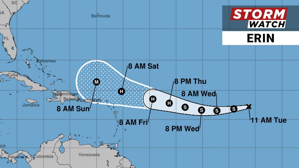 The National Hurricane Center says Erin could strengthen into a hurricane by late Thursday. The storm is currently churning in the eastern Atlantic after forming just west of the Cabo Verde Islands with maximum sustained winds near 45 miles per hour.