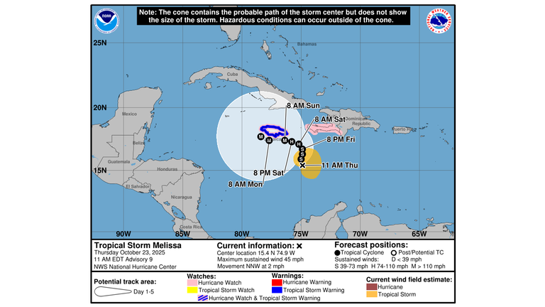 Maximum sustained winds are currently 45-miles-per-hour. The NHC says it's possible Melissa could become a major category 4 hurricane with maximum winds of 130 miles per hour.