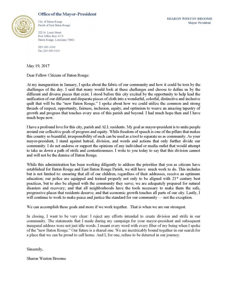 “...I stand against hatred, division, and words and actions that only further divide our community. I do not endorse or support the opinions of any individual or media outlet that would attempt to take us down a path of strife and contentiousness. I write to you today to say that this division cannot and will not be the demise of Baton Rouge,” the mayor wrote.