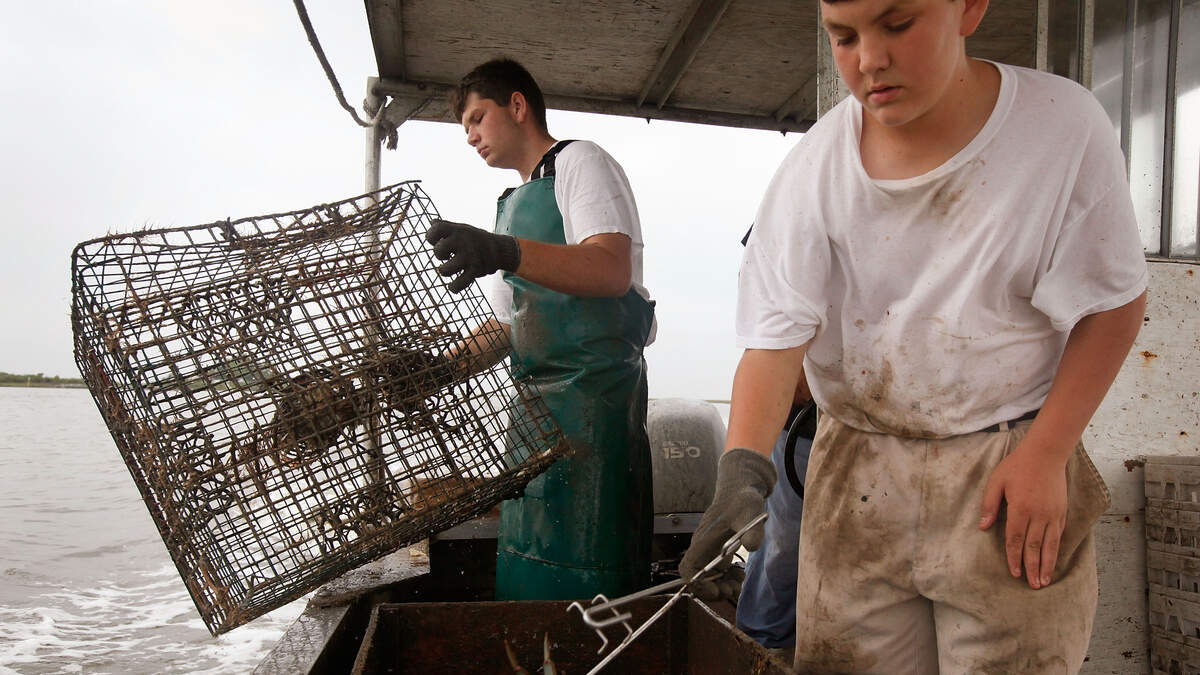 Gary Matherne (L), 15, prepares to toss a trap into the water as he fishes for blue crab with his brother Randy, 12, on their father's boat in the Barataria-Terrebonne National Estuary on May 3, 2010 near Port Fourchon, Louisiana.Photo: Scott Olson/Getty Images