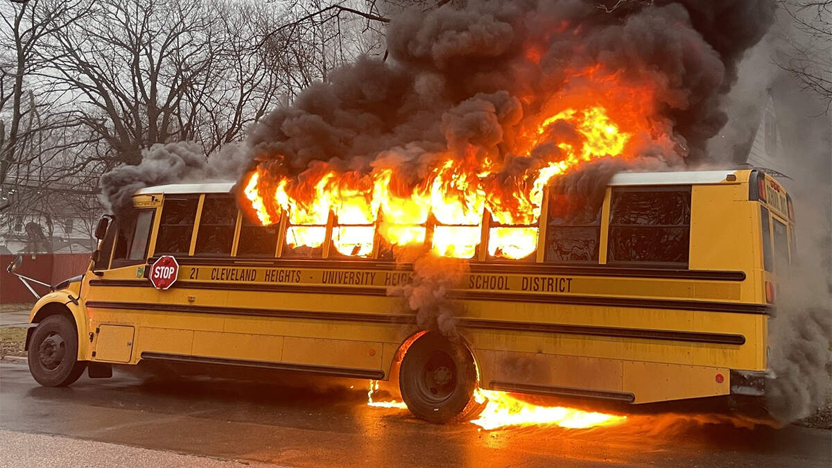 The Cleveland Heights Fire Department shared photos from the scene, showing flames and smoke engulfing the bus, but the fire was quickly brought under control.