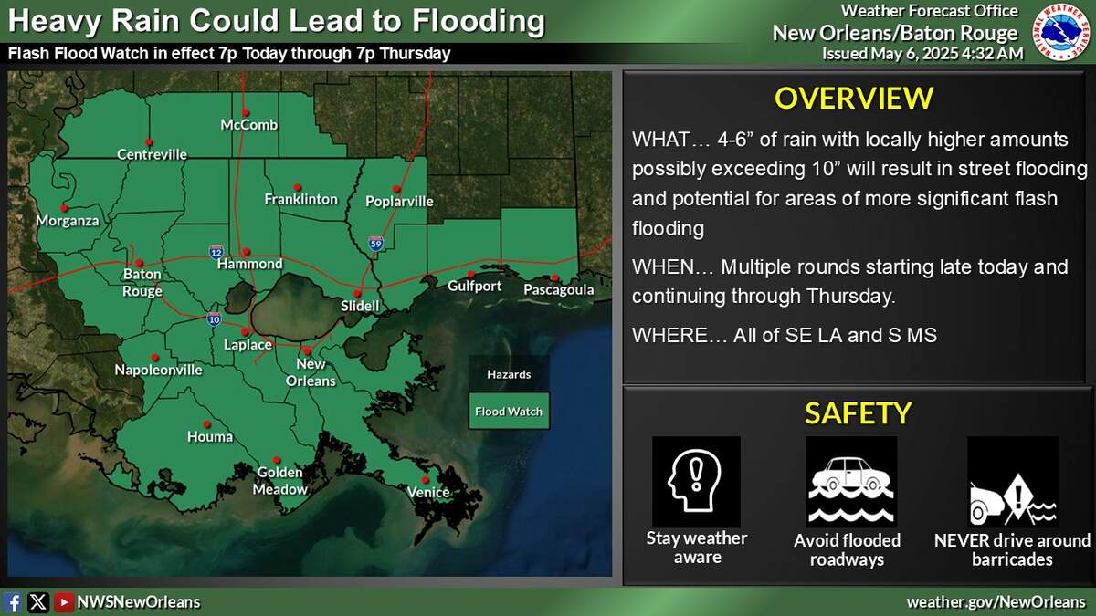 A flood watch will be in effect for the next couple of days in an area that stretches from Baton Rouge to New Orleans.
