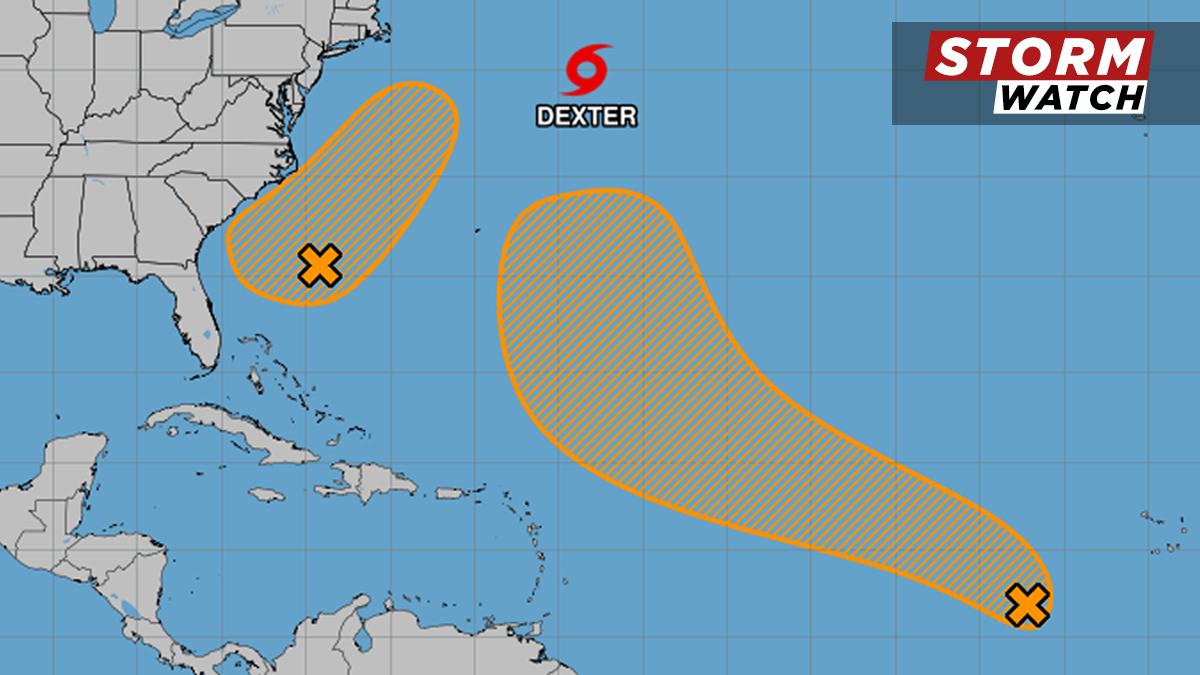 Forecasters at the National Hurricane Center continue to watch two areas for possible tropical development over the Atlantic Ocean, as well as Tropical Storm Dexter which continues to move away from land.
