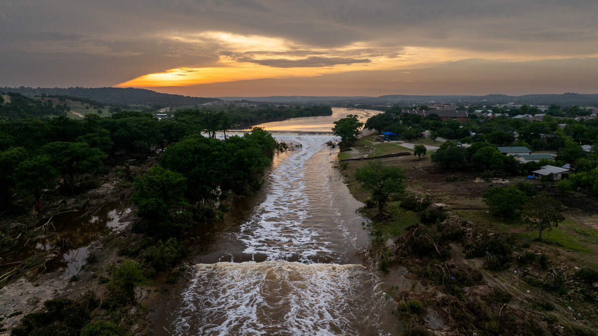 In an aerial view, the sun sets over the Guadalupe River on July 06, 2025 in Kerrville, Texas.Photo: Brandon Bell / Getty Images News / Getty Images